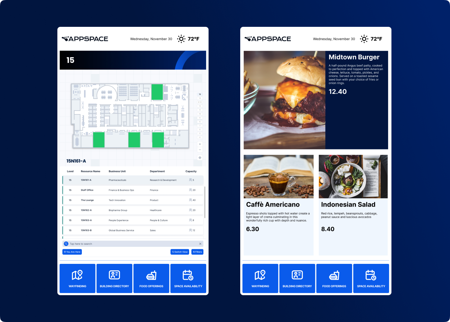 To create a wow factor for the new HQ, we created custom kiosks that offer employees and visitors four key services: